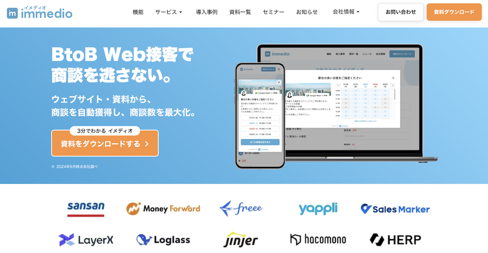 こうした課題を解決するために登場したのが、株式会社immedioが提供する「immedio(イメディオ)」です。immedioは、Webフォーム経由での問い合わせ直後に、電話などの人手を介さずにオンラインで商談日程の調整を自動化する「商談獲得自動化サービス」です。