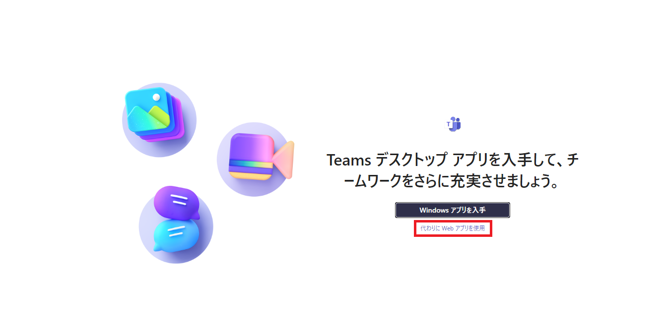 作成したアカウントでWeb版のTeamsに入ります。Web版のメリットは使う端末にアプリ版が入っていなくとも、すぐに始められるところです。