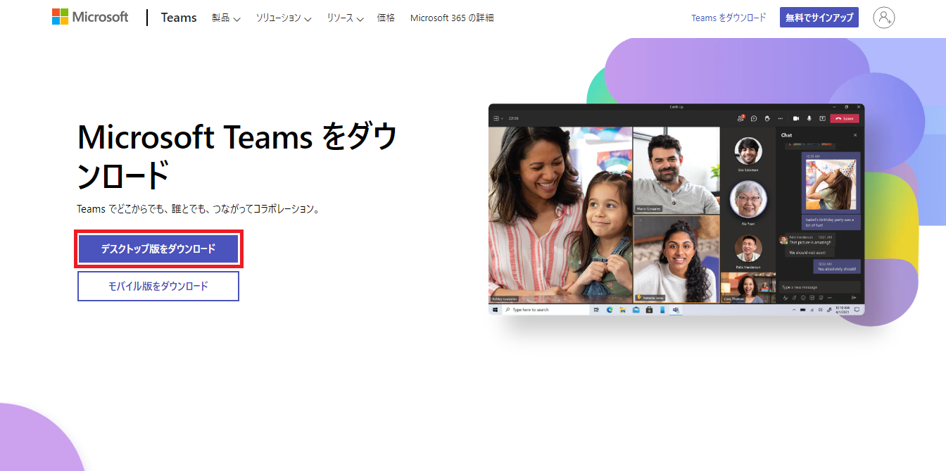 Micosoft Teamsのサイトにアクセスし、画面左の「デスクトップ版をダウンロード」を押します。