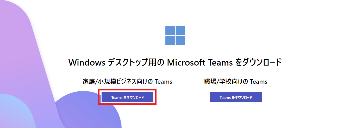 「家庭/小規模ビジネス向けの Teams」と「職場/学校向けの Teams」の2種類が表示されますので、ここでは「家庭/小規模ビジネス向けの Teams」を選択します。