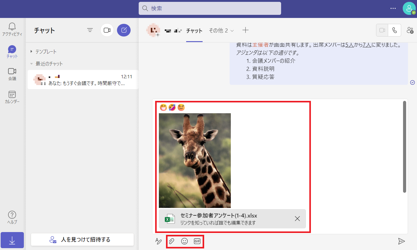 チャットでは「ファイルを添付」「絵文字」「GIF」機能を利用することも可能です。