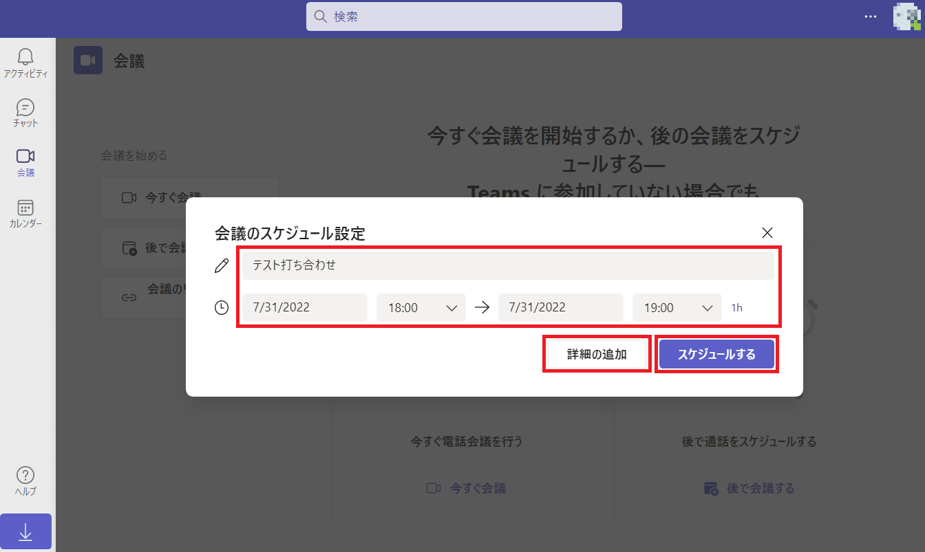 「スケジュールする」で会議の設定は完了です。なお「詳細の追加」を押すことで詳しい会議内容を設定可能です。