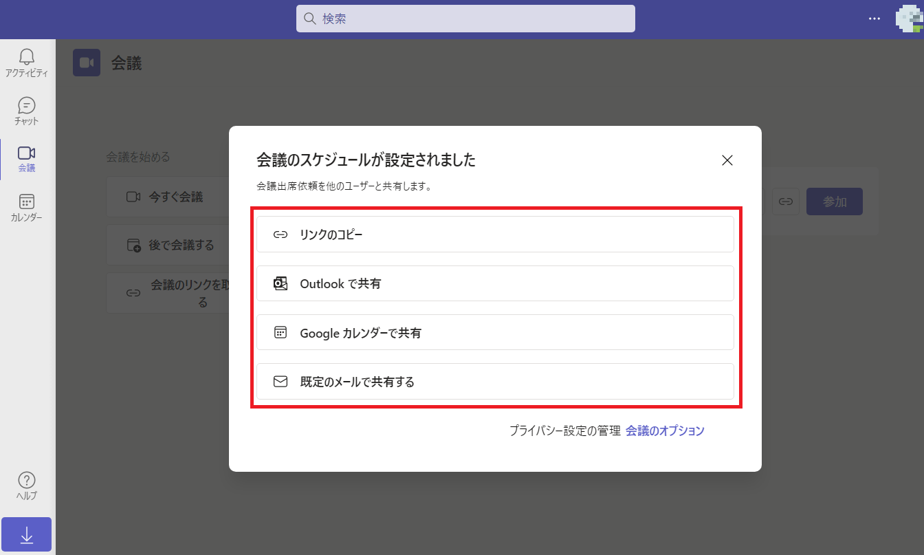 左側に表示されている「会議を始める」には以下の3つの方法があります。