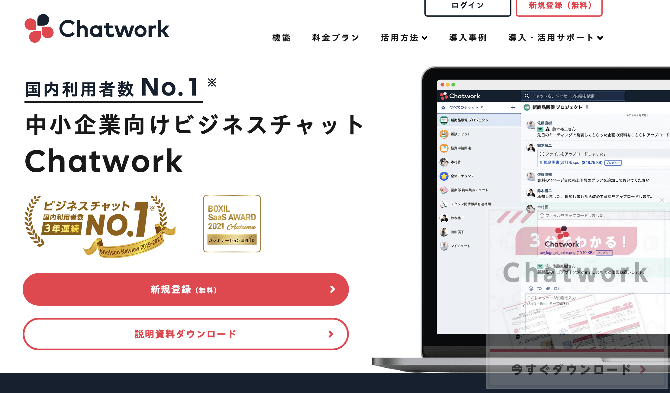国産ツールのChatworkは国産ツールではシェアは高く、ユーザ企業間だけでなく個人業者と企業の間のコミュニケーションでも活躍しています。