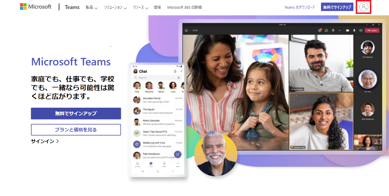 Micosoft Teamsのサイトにアクセスし、右上のアイコンを押してサインイン画面へと進みます。
