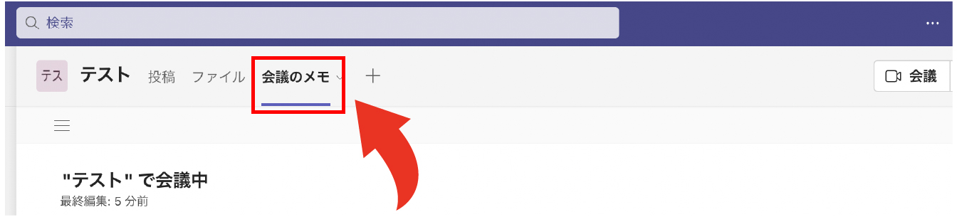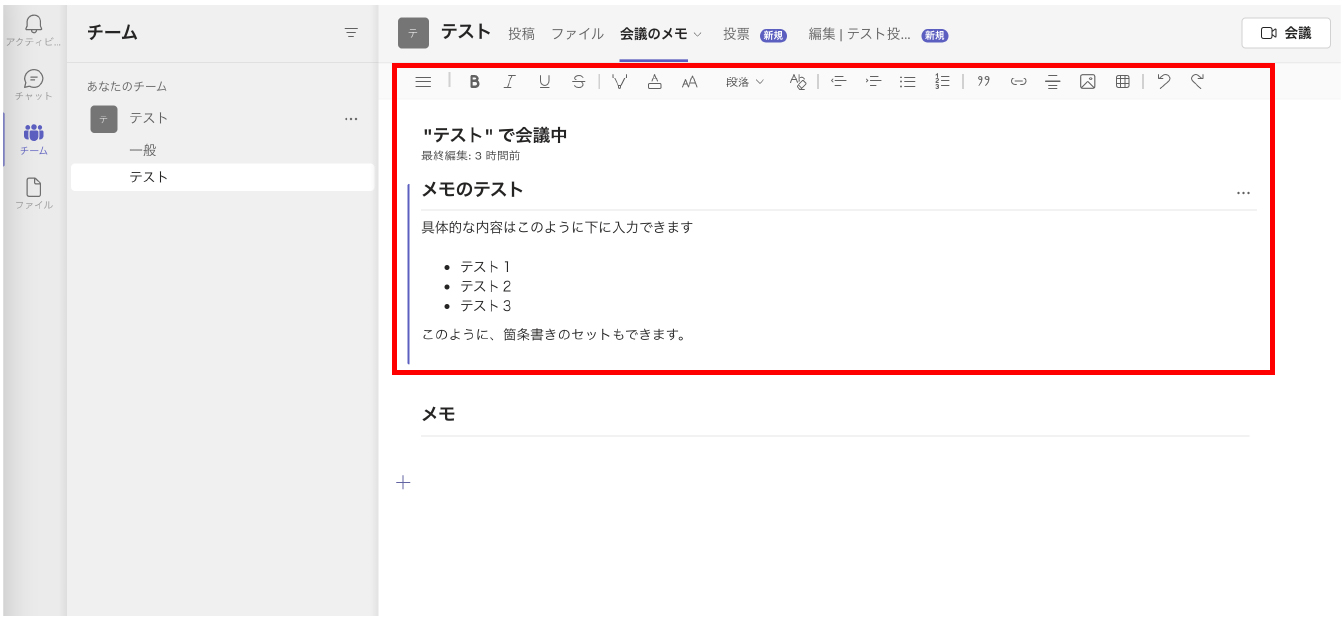 なお、会議の前後にメモを作成する場合はチーム画面上部にあるタブから「会議メモ」をクリックすると同様の画面に遷移し、同じようにメモを作成/編集することができます。