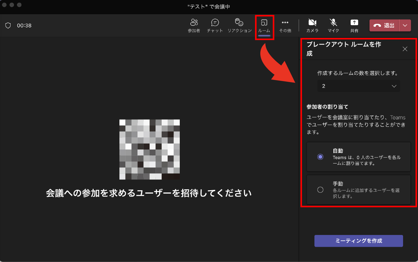 [ルーム]をクリックすると、上の画面のようなブレイクアウトルーム設定画面が表示され、ルームの数や参加者の振り分けをおこなえます。