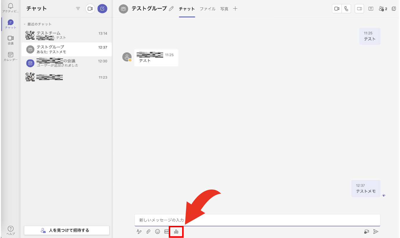 チャットのメッセージ入力画面にある赤枠で囲まれた[ポーリング]アイコンをクリックします。