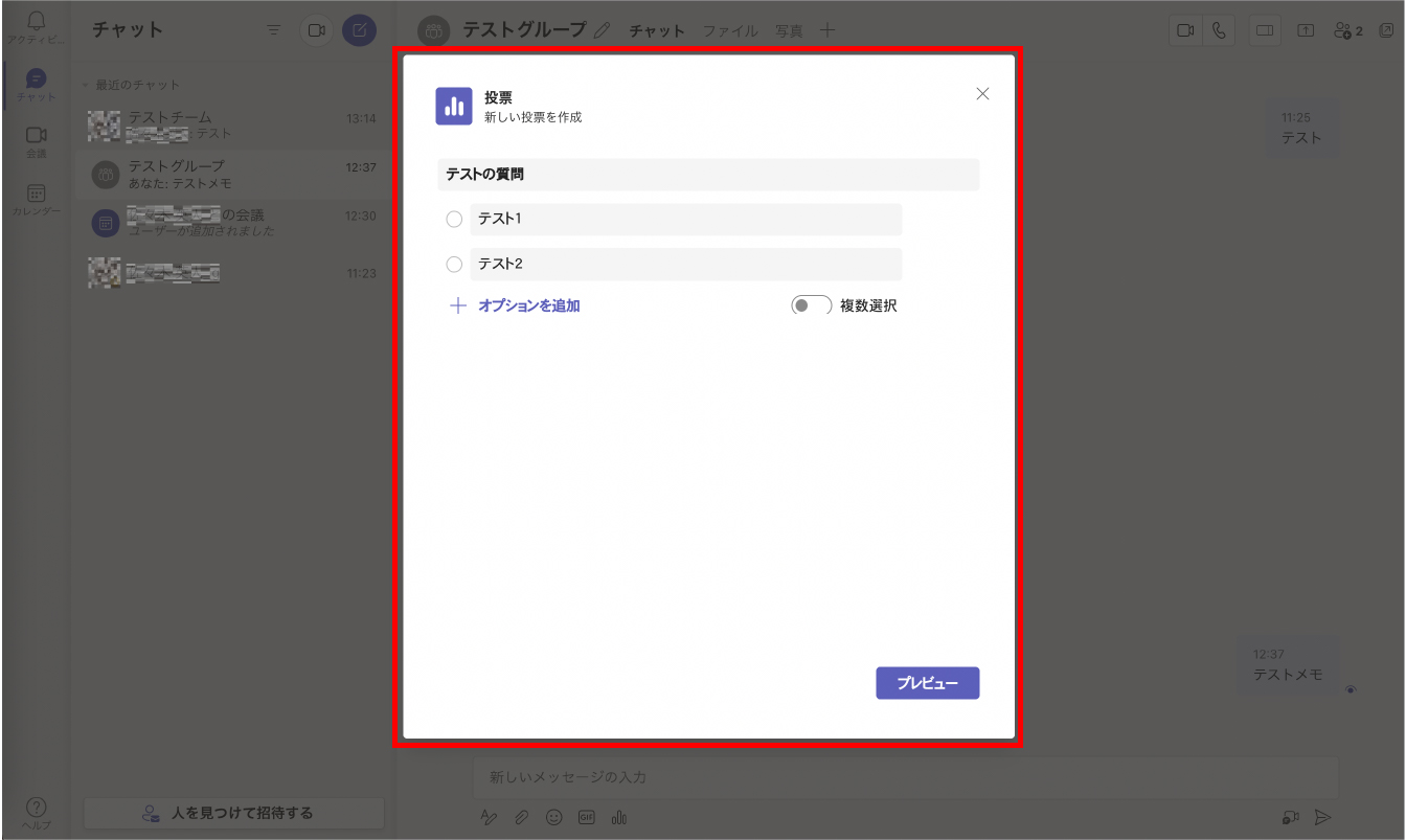投票はMicosoft Teamsのチャット上で簡単に作成することができ、結果の出力も自動でおこなえます。主催者や会議の管理者はデータ集計をすばやくおこなえます。
