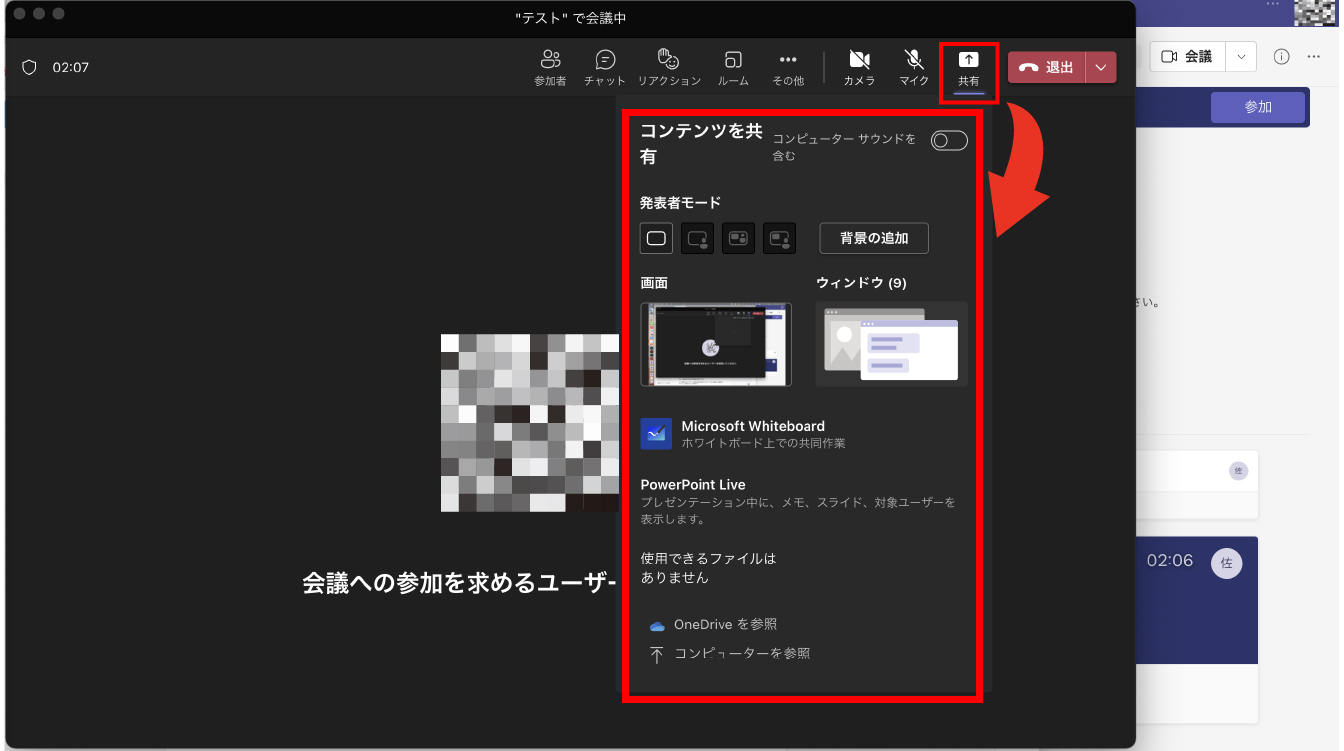 会議中に画面共有する方法については次の通りです。