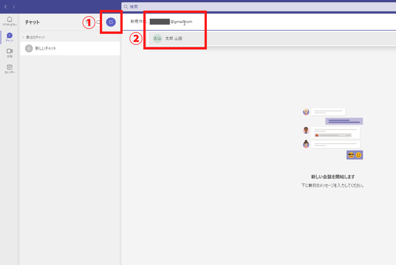 「新規作成」の欄にチャットをしたい相手のメールアドレスや電話番号を入力。