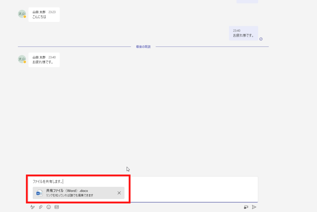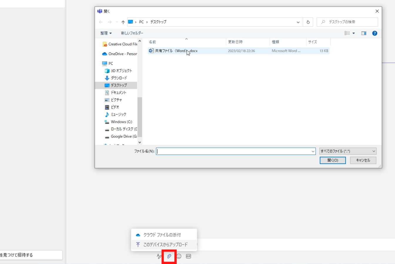 メッセージ入力欄の下にある「クリップのアイコン」をクリックして、共有したいファイルを選択する。
