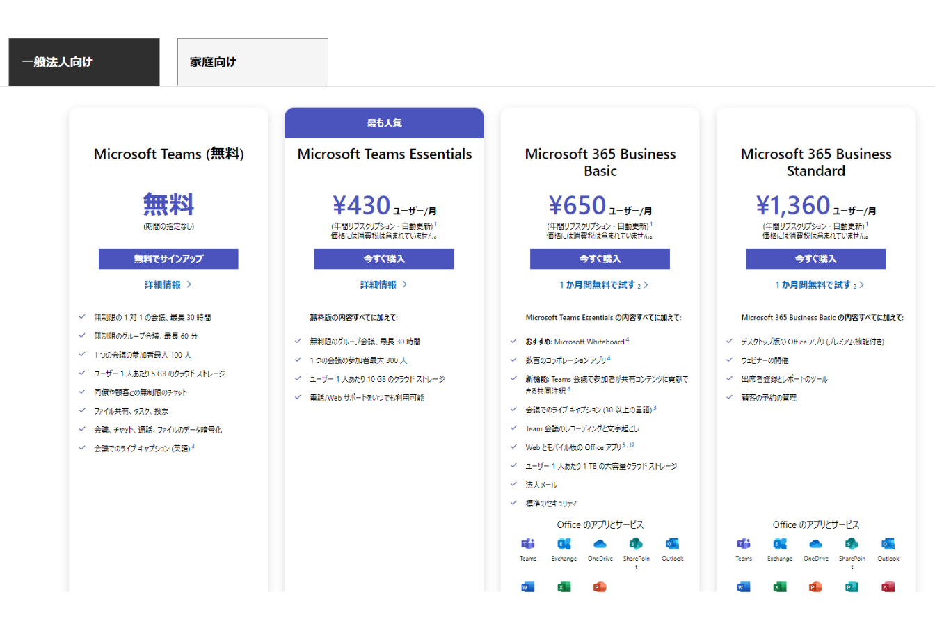 MicrosoftOffice Teams単体での月額料金は、企業向けで430円から利用可能となっています。