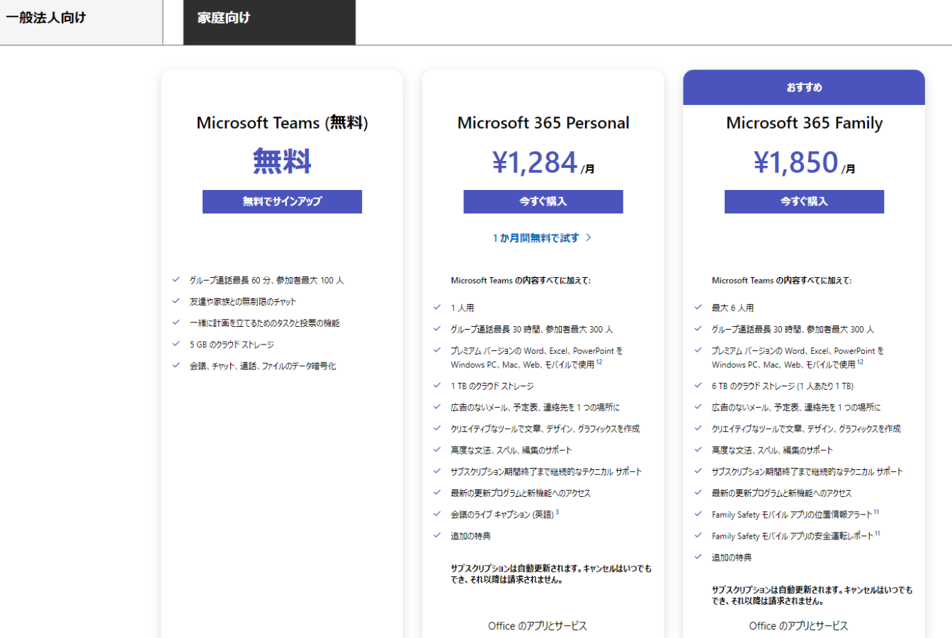 個人のMicrosoft365サブスクリプションは、MicrosoftOffice Teams以外のアプリも利用できるようになりますが、月額1,284円と企業に比べて料金が高めです。