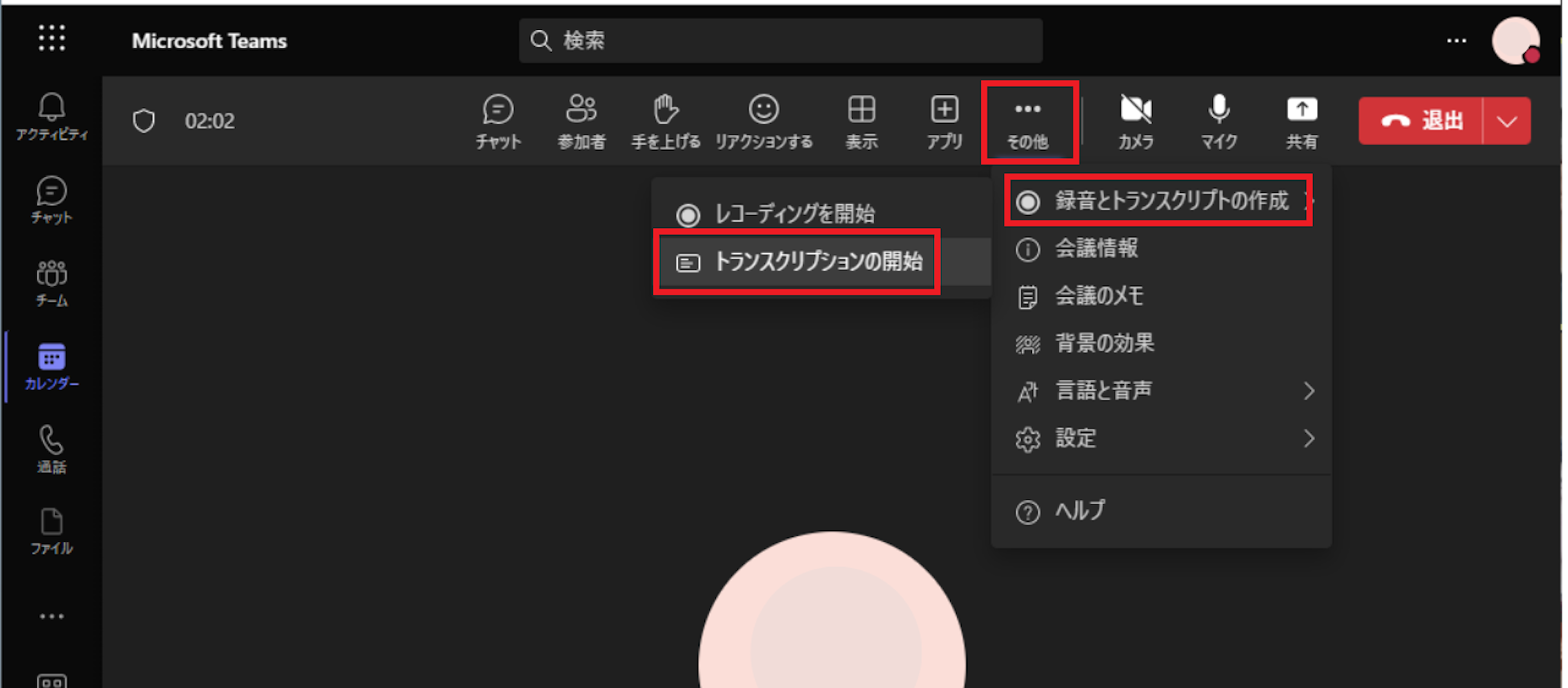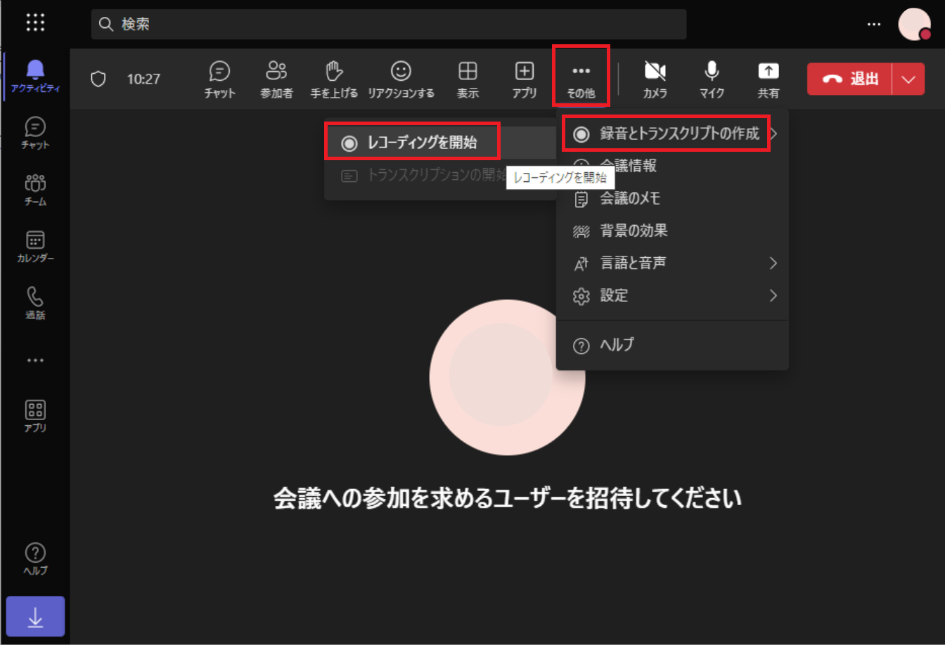 次に表示されたメニューから[録画とトランスクリプト]-[レコーディングを開始]をクリックします。