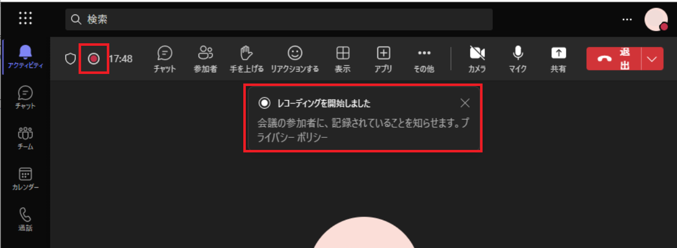 参加者には録画されていることが一目で分かるようになっていますが、ビジネスマナーとして、レコーディング機能を使う前に、会議を録画することをお知らせした方がよいでしょう。
