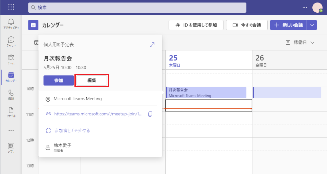 予約した会議をクリックし、表示されたダイアログの[編集]ボタンをクリックします。