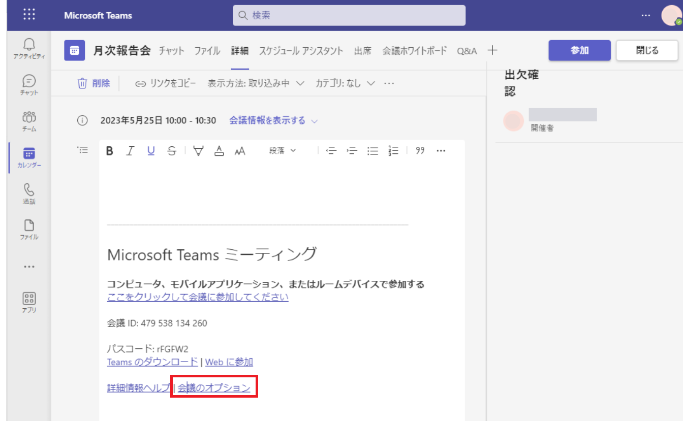 [会議のオプション]をクリックし、会議のオプション画面を表示します。