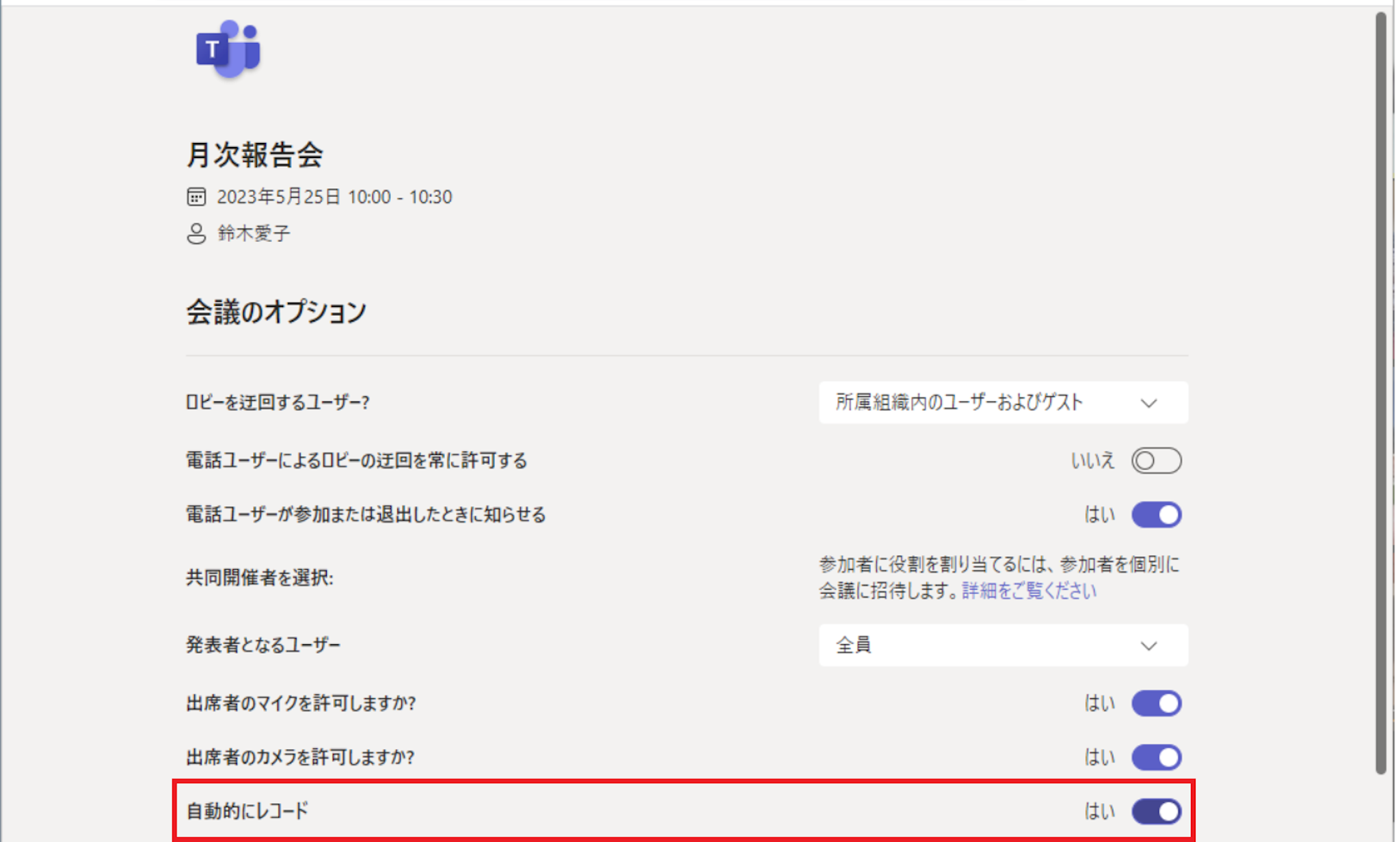 事前に録画設定する場合も、会議の招待メールか会議のチャットを使用して、会議を録画することを参加者にお知らせしておきましょう。