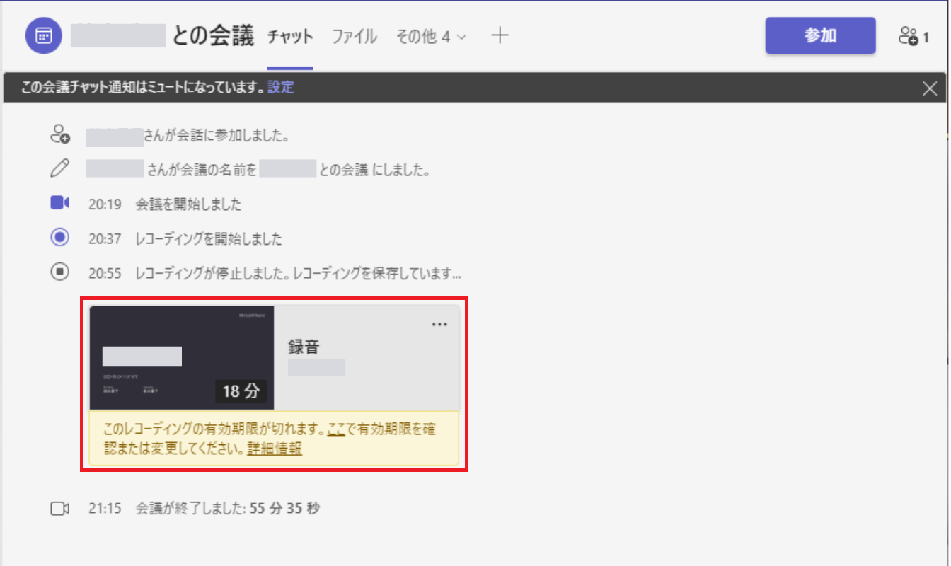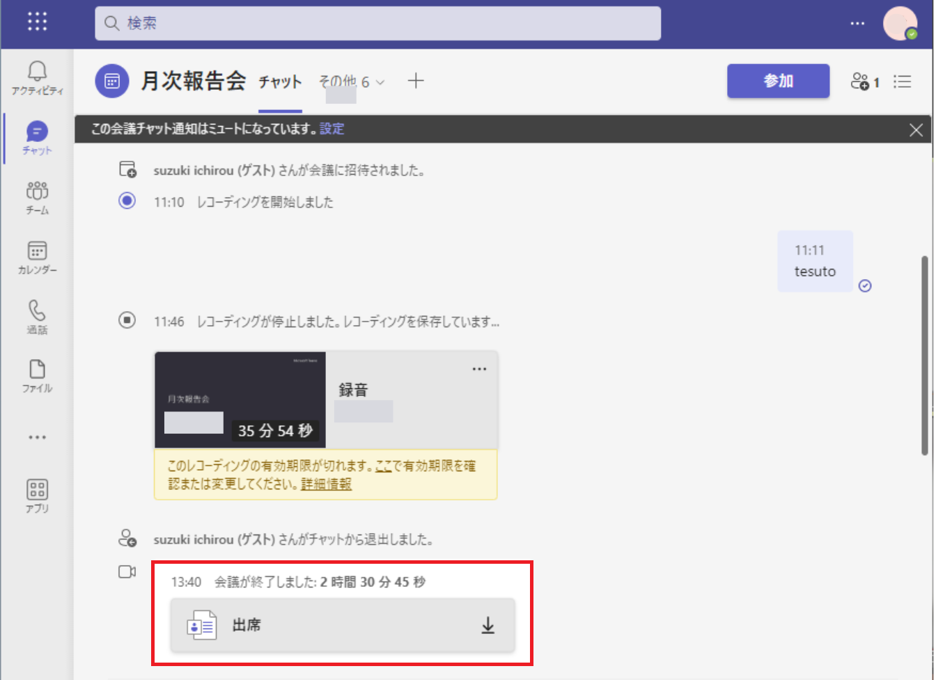 会議終了後、会議のチャットに録画データが表示されます。