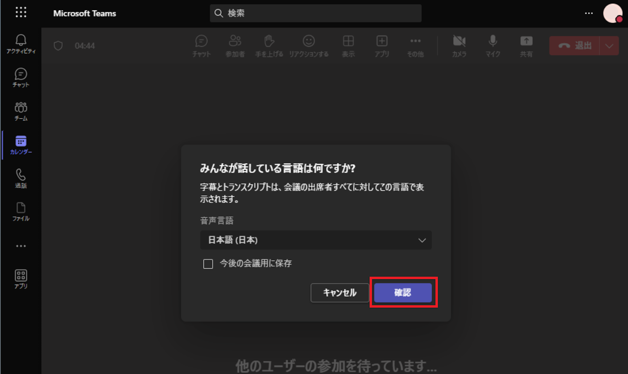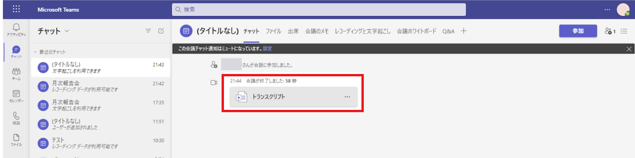 会議が終わると、録画データと同じように、会議のチャットにトランスクリプトデータが表示されます。