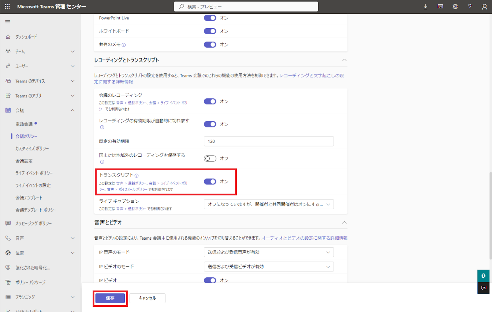トランスクリプトの設定変更が反映されるまでには、最大で24時間かかります。
