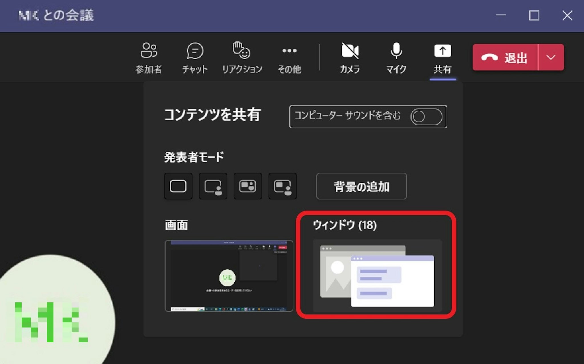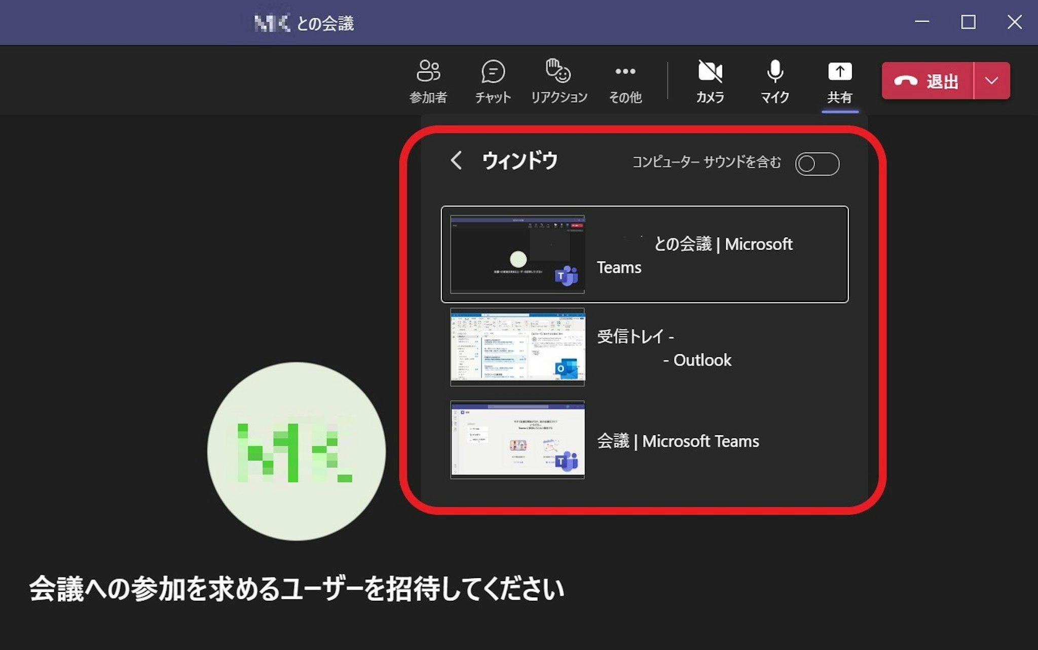 「ウィンドウ」をクリックすると、今デスクトップに開いているウィンドウを選択して共有することができます。