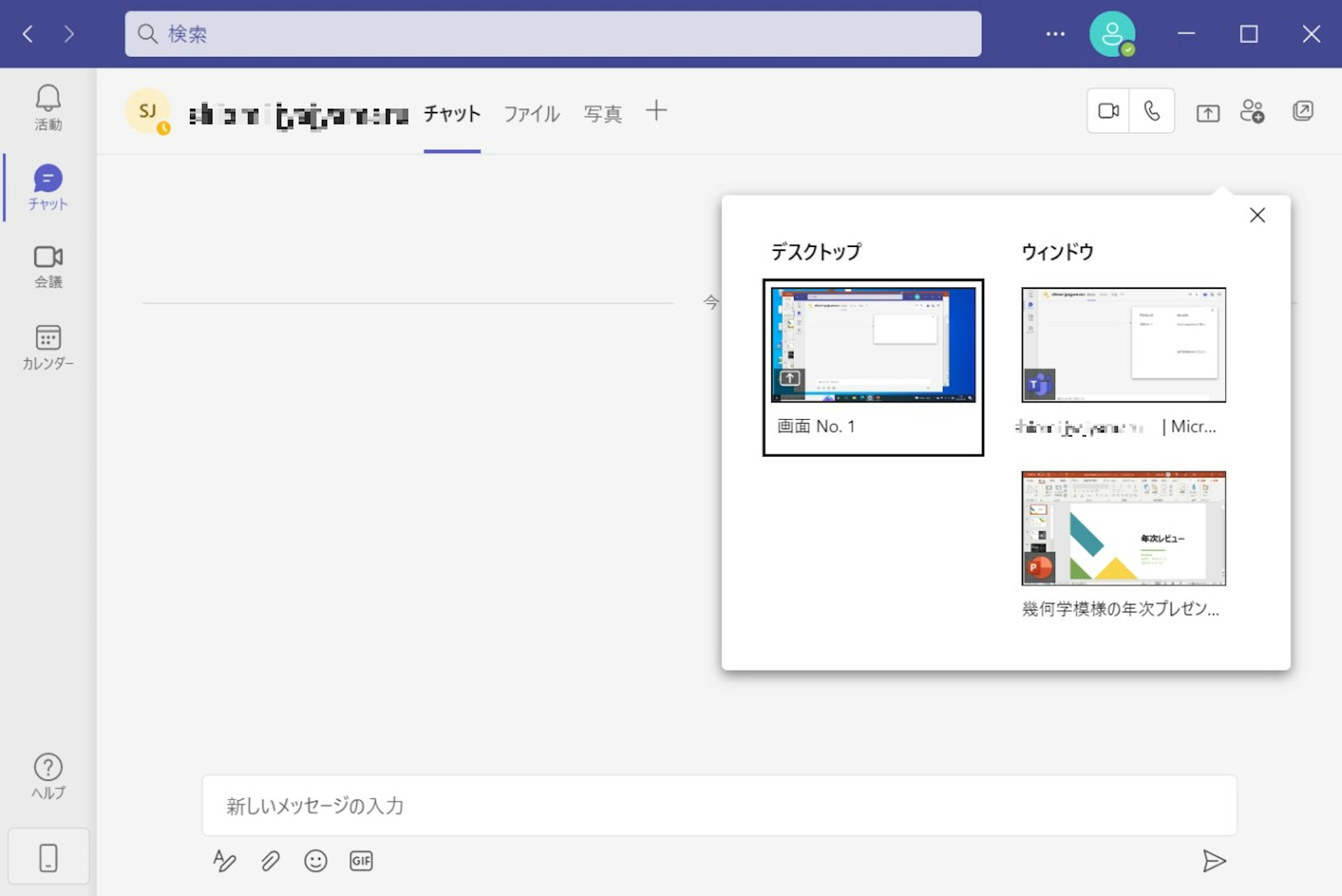 Web版Teamsでは、Web会議のみ画像共有ができます。チャットでは画面共有ができませんので、Web会議で画面の共有を行ってください。