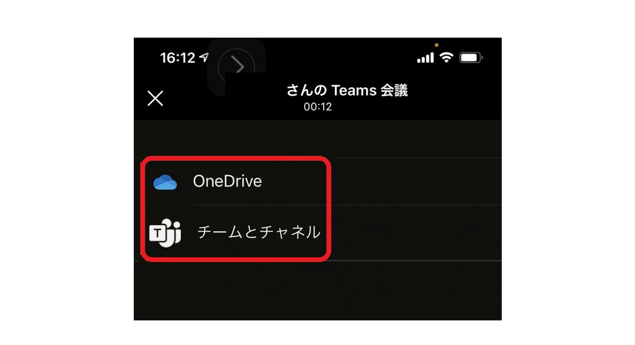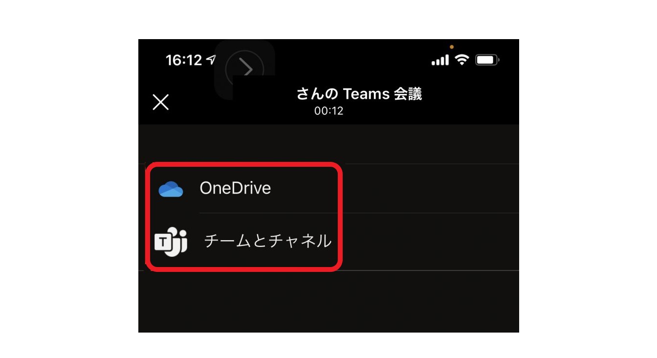 「OneDrive」と「チームとチャネル」のどちらかを選択できますので、共有したいファイルが保存されている場所をタップし、共有するファイルを選択します。