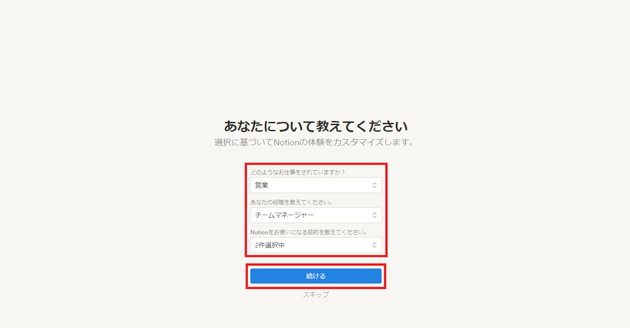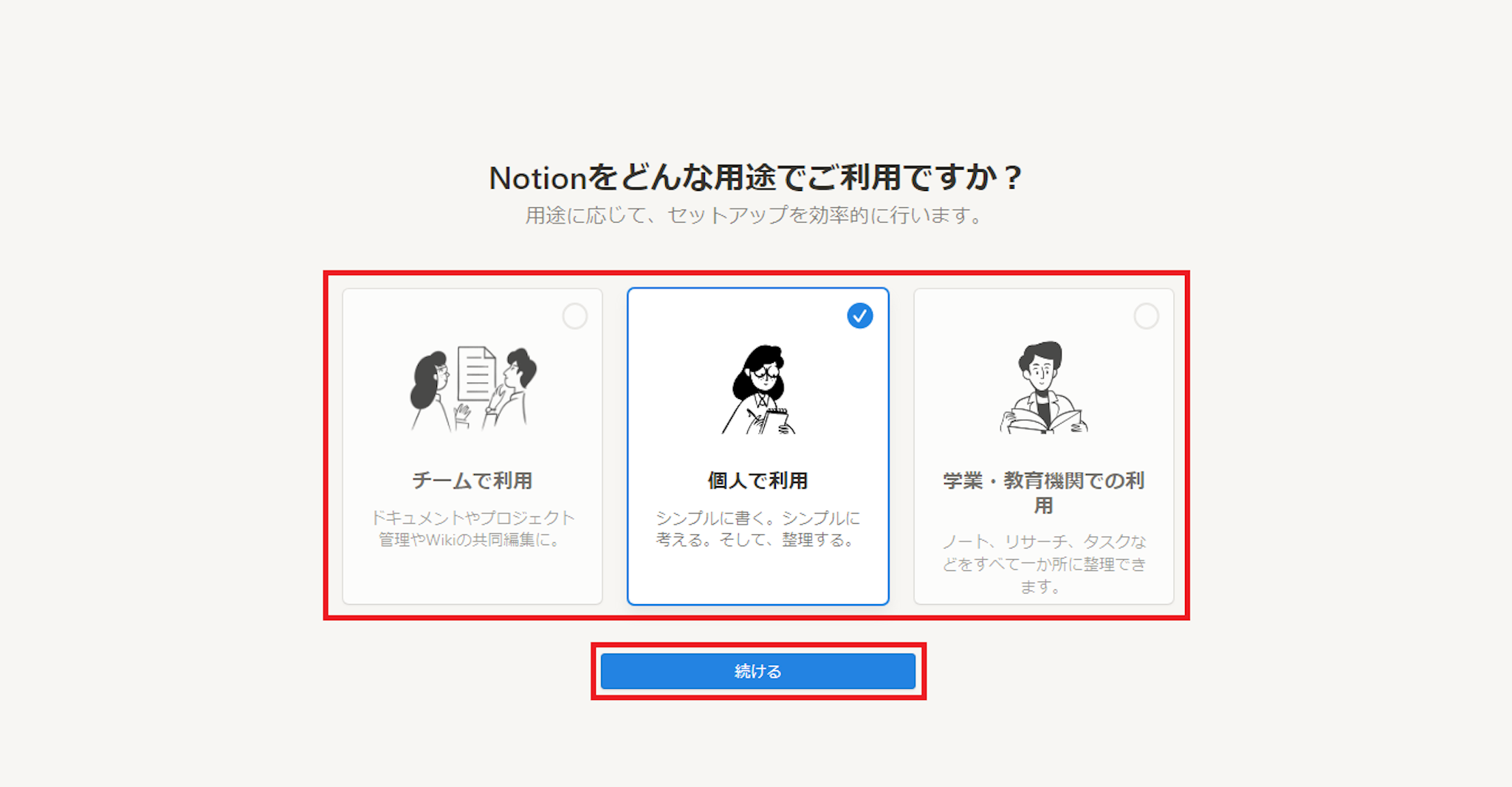 表示された3つの用途「チームで利用」「個人で利用」「学業・教育機関での利用」から目的に合ったものを選択します。