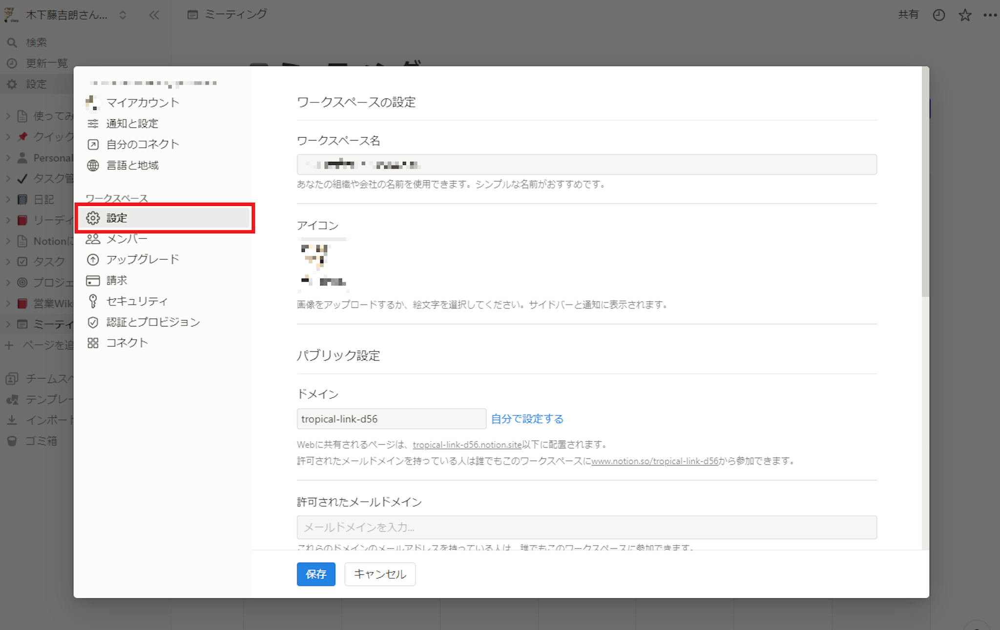画面の表記が英語の場合はメニューの「言語と地域」から日本語を設定してください。メンバーの確認や招待は「メンバー」から入ります。