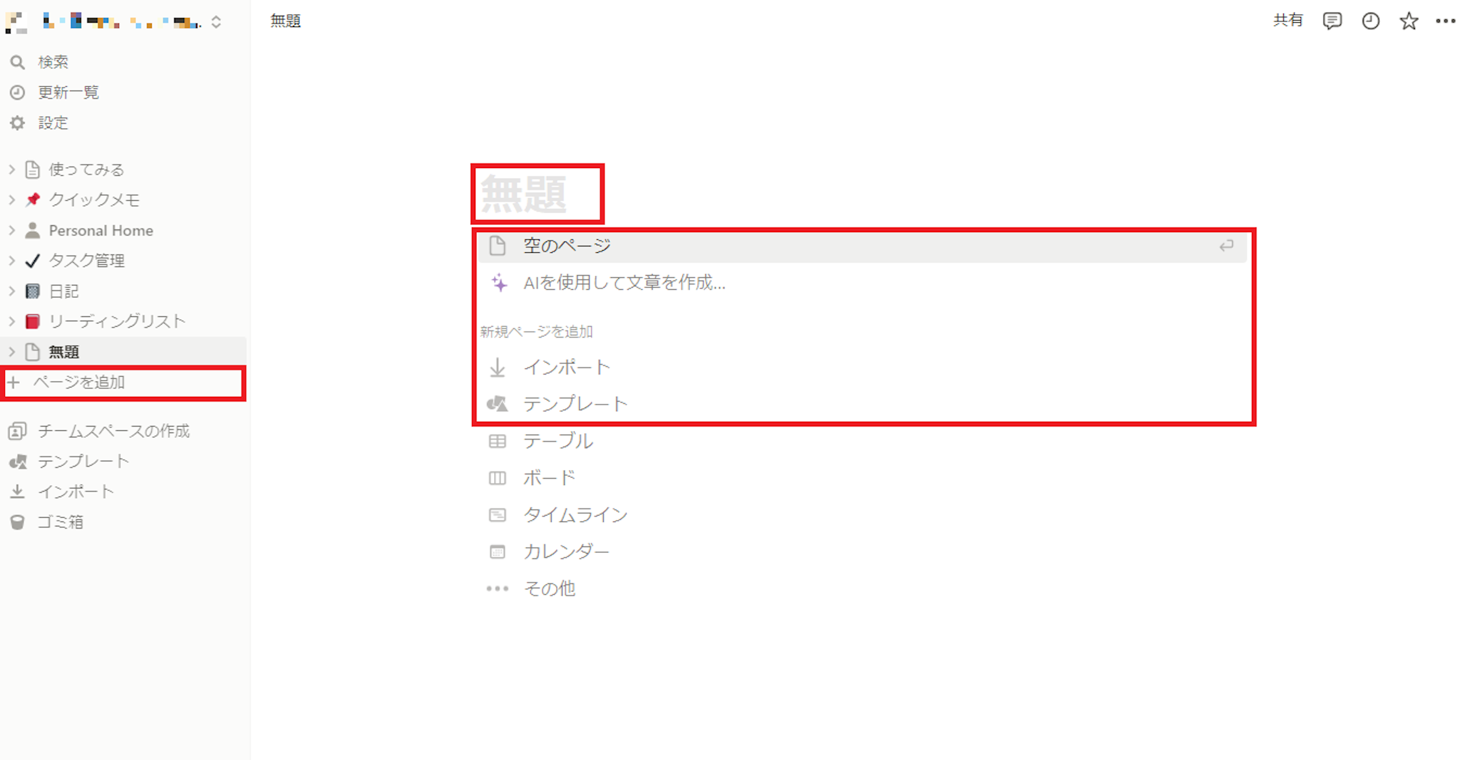 画面左のメニュー一覧の「+ ページを追加」を押して、「無題」のページを作成します。