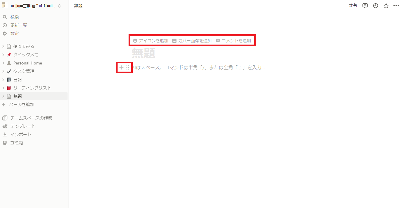 タイトル下に入力スペースがありますので、文章を入力していきます。入力スペースの左に「+」と「6点リーダ」が表示されます。「+」は上下に入力スペース(ブロック)を追加します。