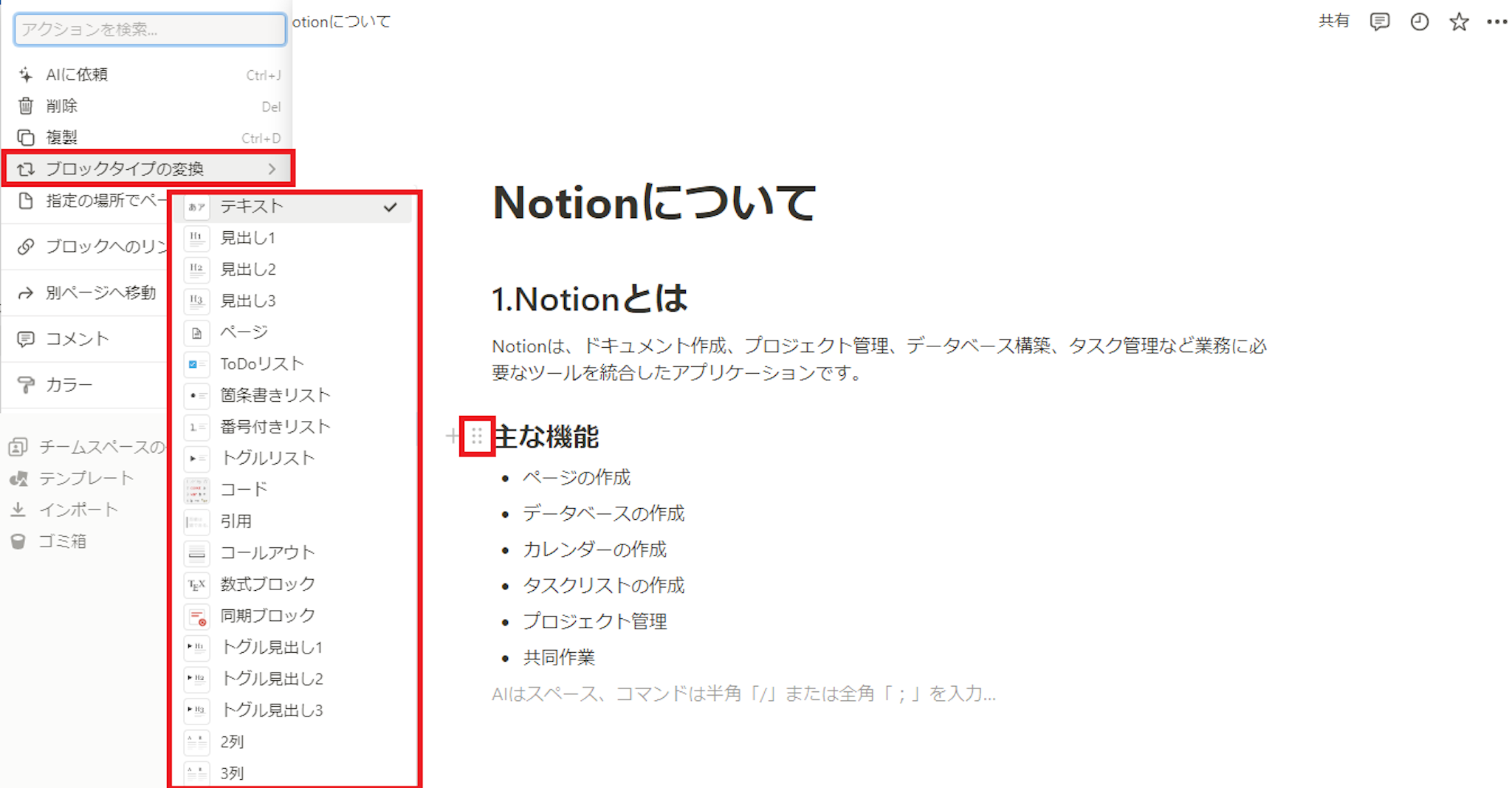 各文章のブロックタイプ(タイトルや本文、リスト等)は「6点リーダ」を押して変更が可能です。
