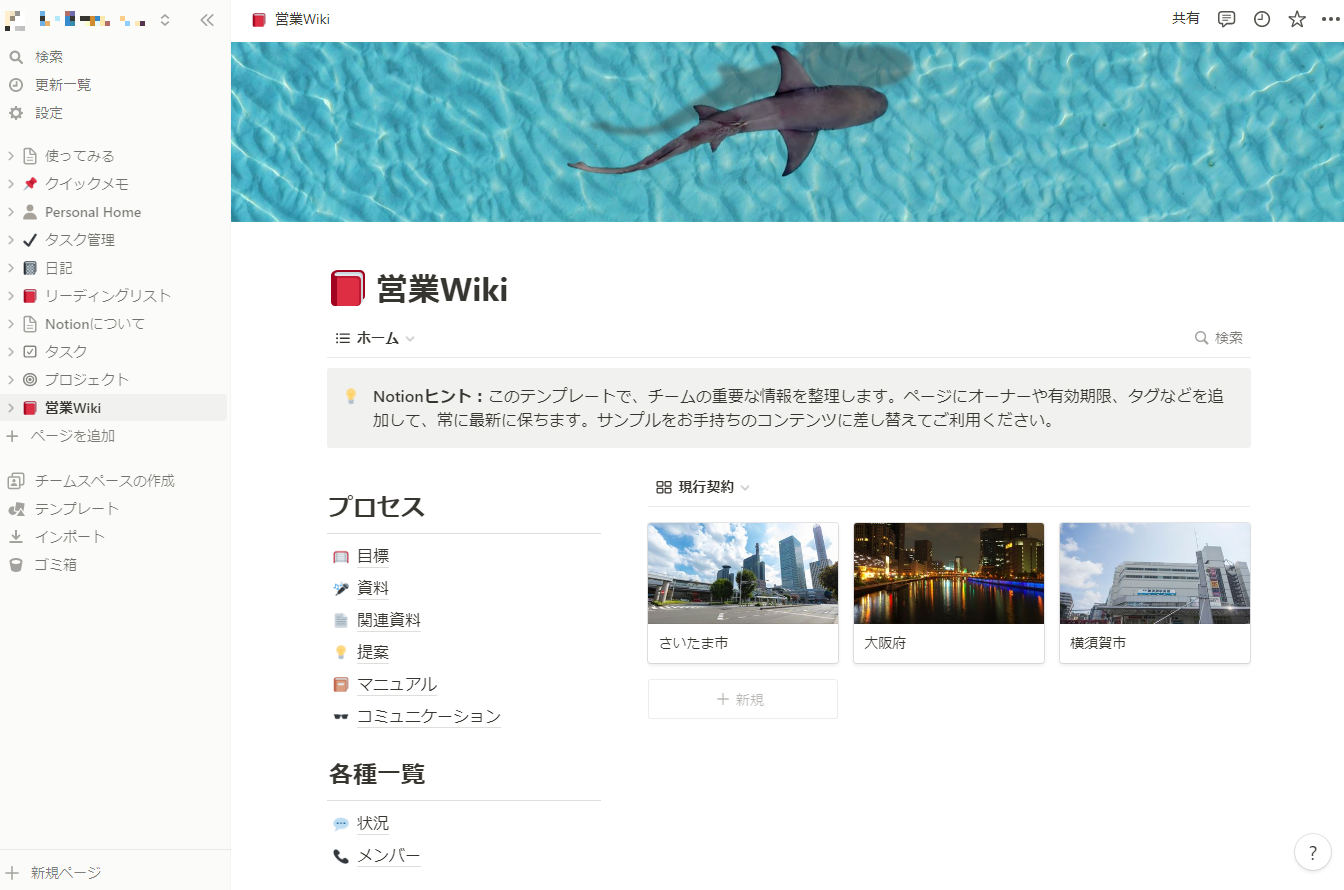 「営業Wiki」のテンプレートのように、1ページにテキストやリンク、写真などの情報をまとめてのせることも可能です。
