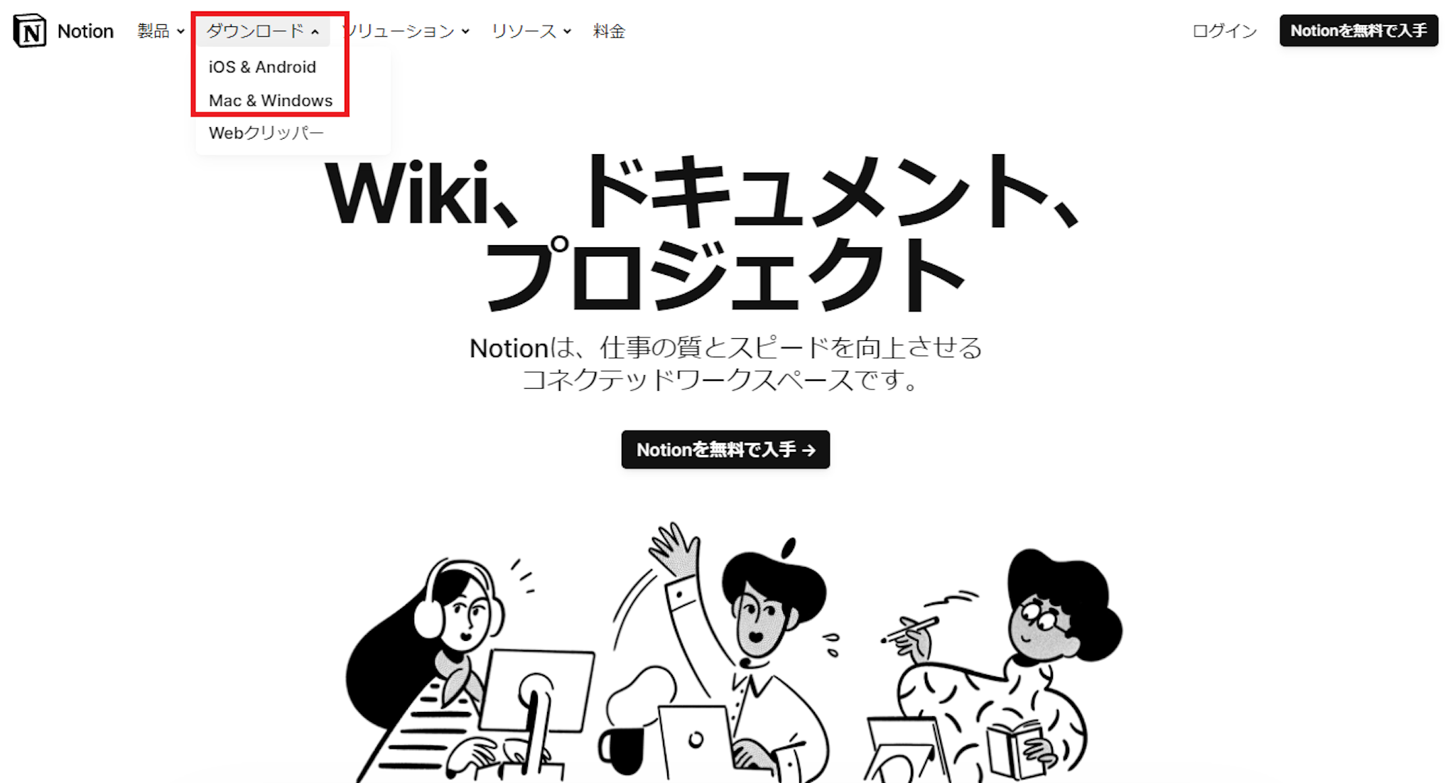 最初にNotionのサイトトップ画面から「Notionを無料で入手」を押します。
