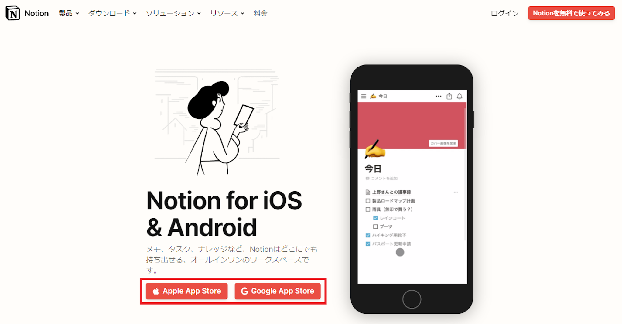 iOS版のNotionアプリは、「Apple App Store」に移動してダウンロードして利用します。iPhoneとiPadの両方で利用することができます。