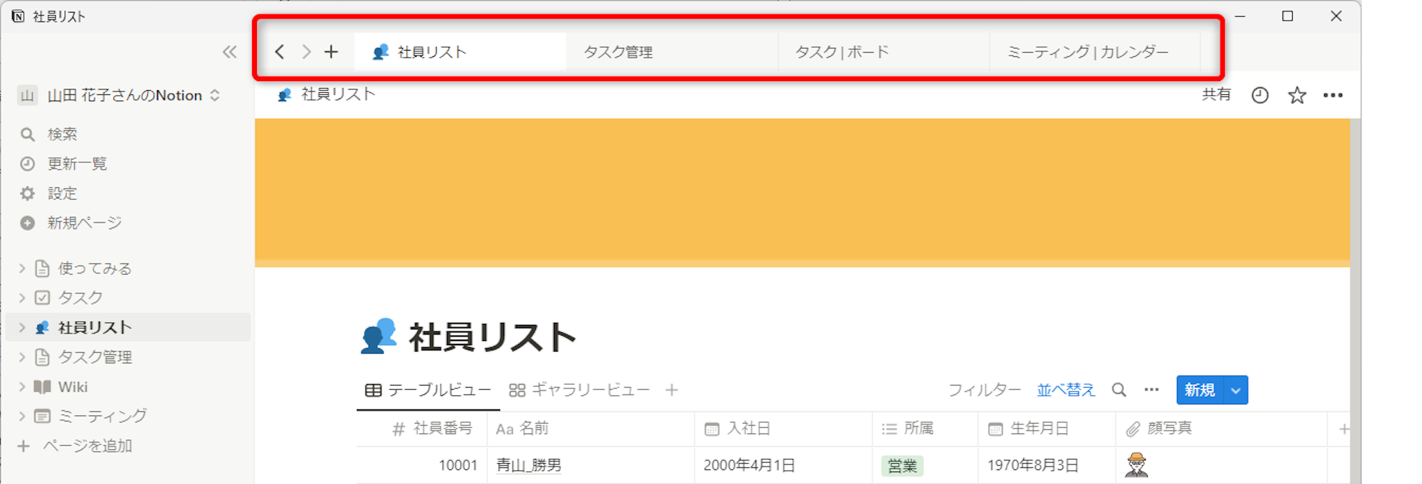 デスクトップアプリでは、複数のページをタブ表示することが可能です。
