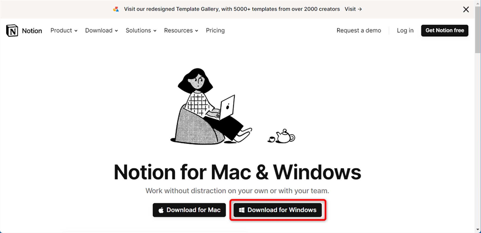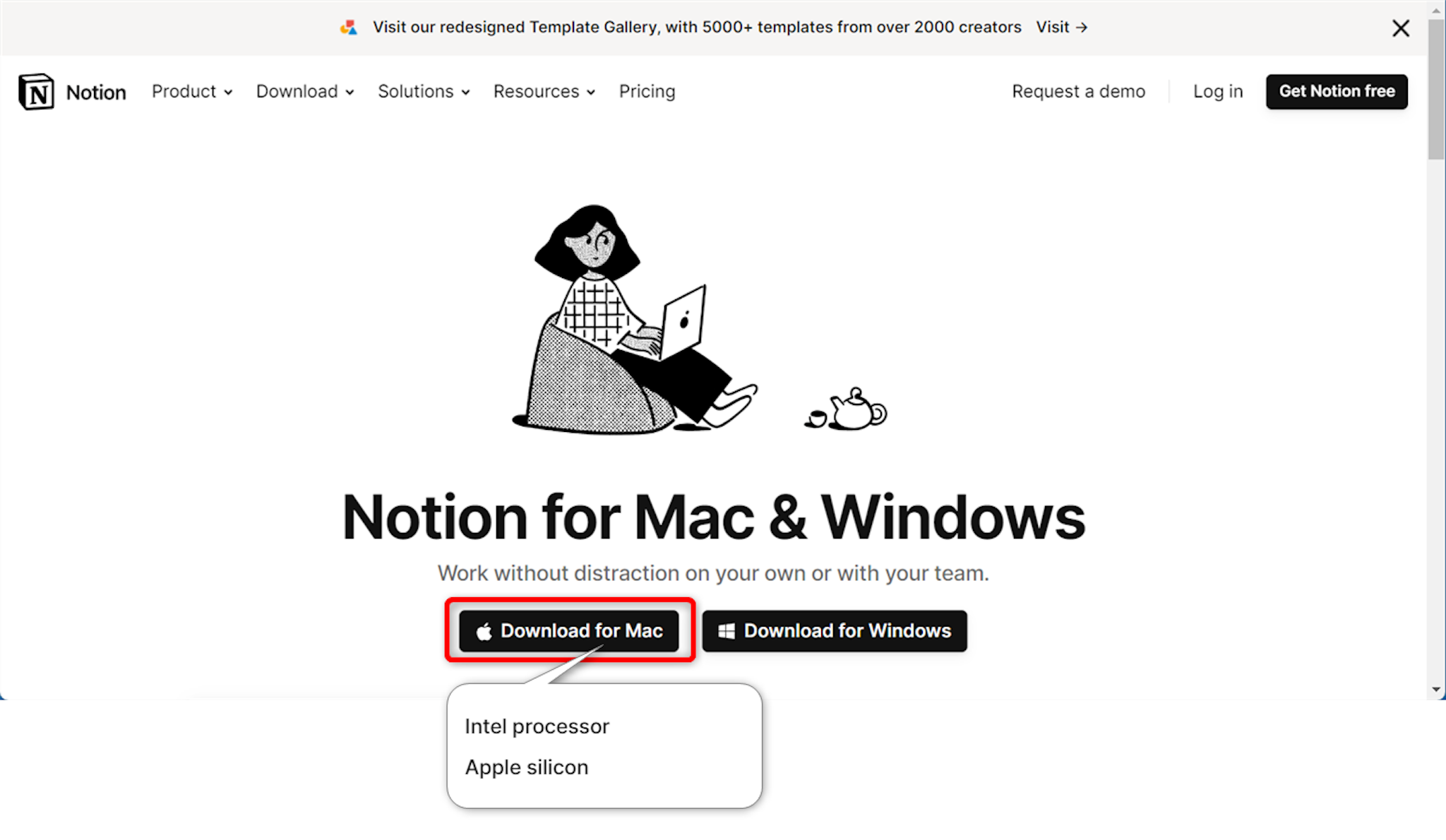 Notionのデスクトップアプリのダウンロードページにアクセスします。
