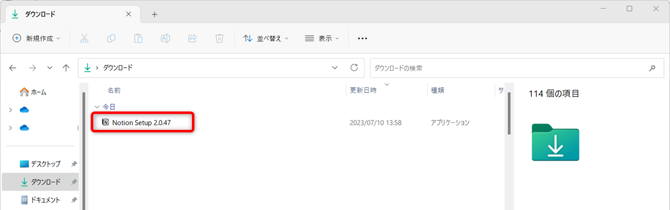 ダウンロードした「Notion Setup (バージョン番号).exe」をダブルクリックします。