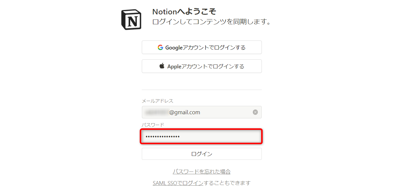 Googleアカウント、またはAppleアカウントでNotionを利用している場合は、各ログインボタンをクリックしてください。