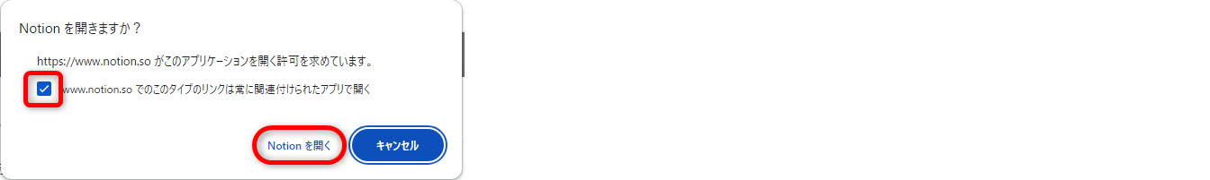 「www.notion.so でのこのタイプのリンクは常に関連付けられたアプリで開く」にチェックを入れ、[Notionを開く]をクリックします。
