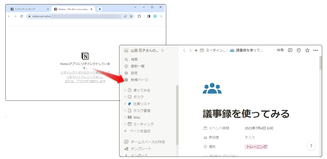 リンクをクリックすると、Webブラウザからリダイレクトして、Notionアプリで開くことができました。