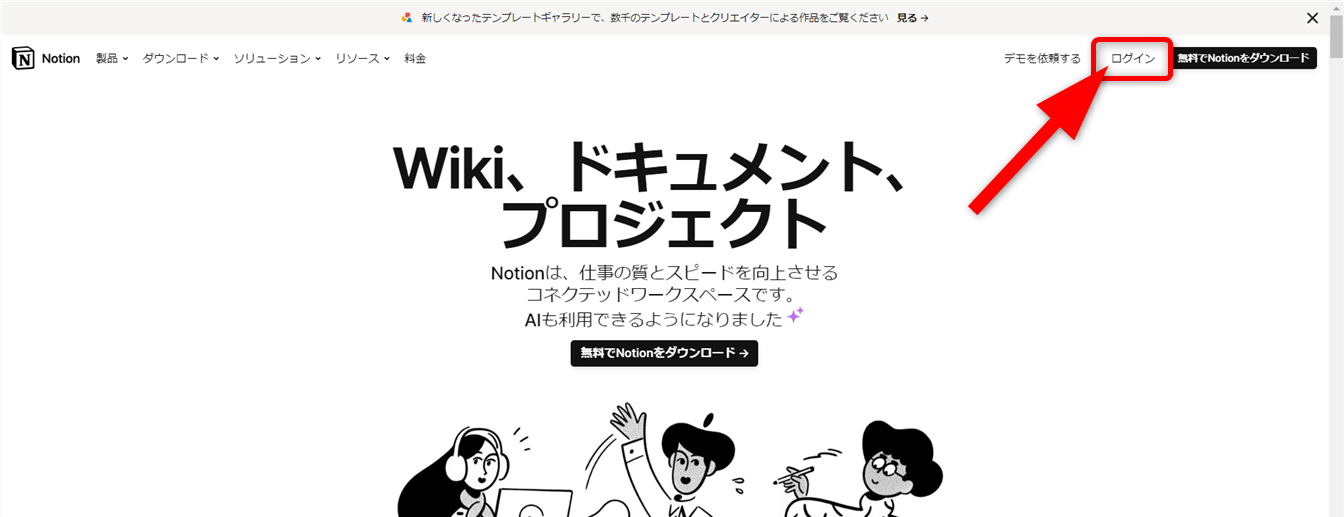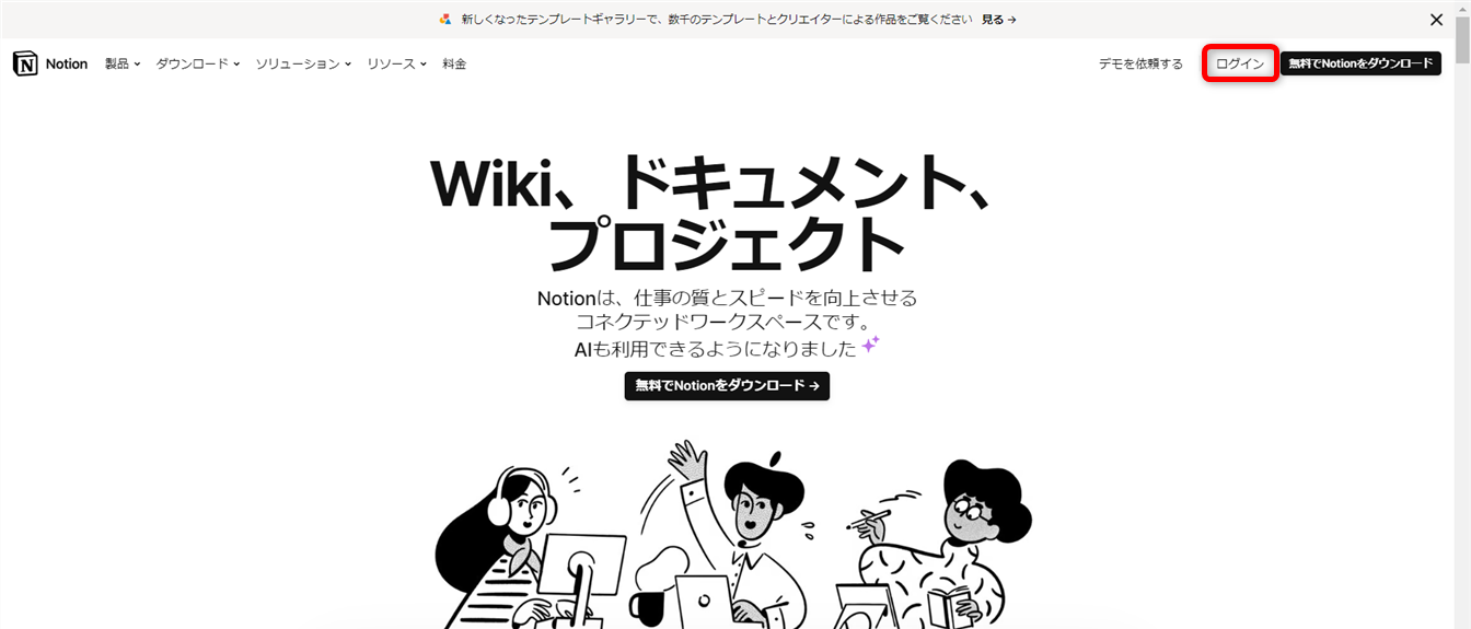 Notionにアクセスし、[ログイン]をクリックします。