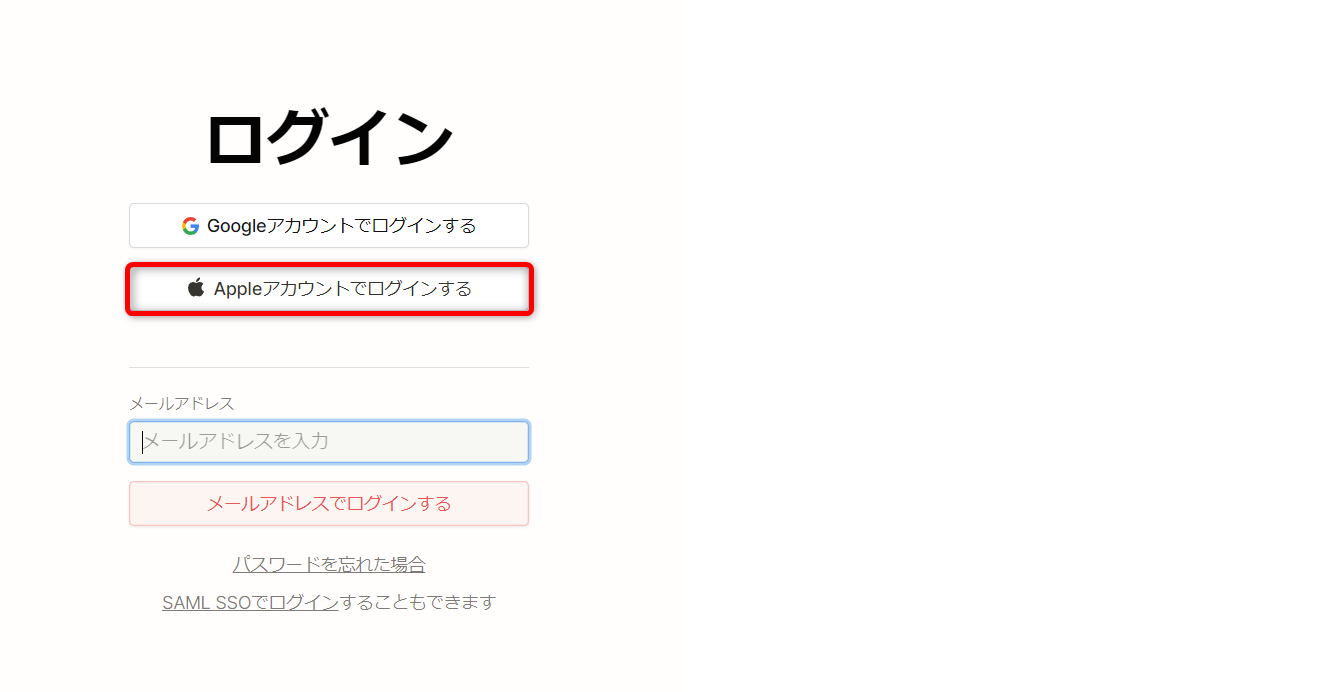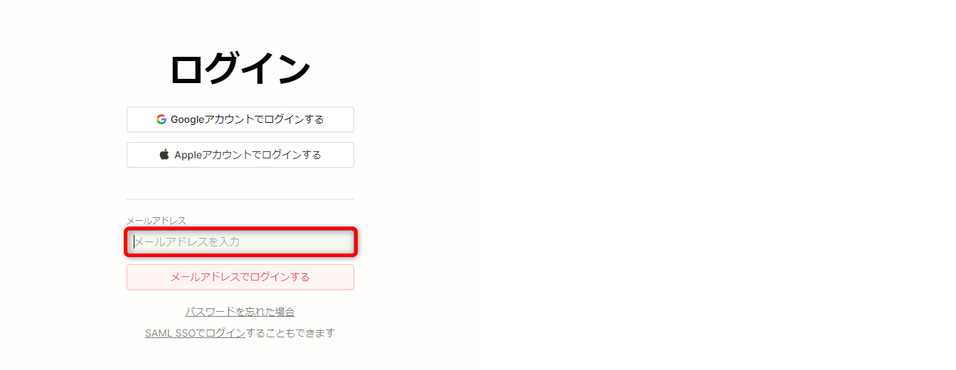 会社で使う場合など、GoogleやAppleのアカウントが紐づけできない場合は、メールアドレスとパスワードでログインできます。
