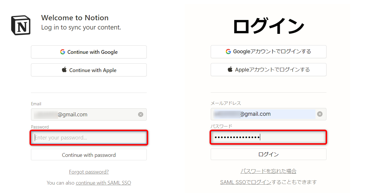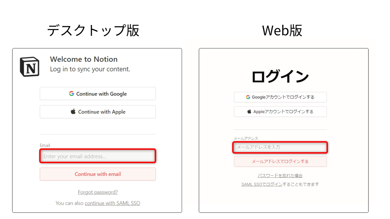 Web版とデスクトップアプリ版のNotionは、こちらの方法でログインできます。