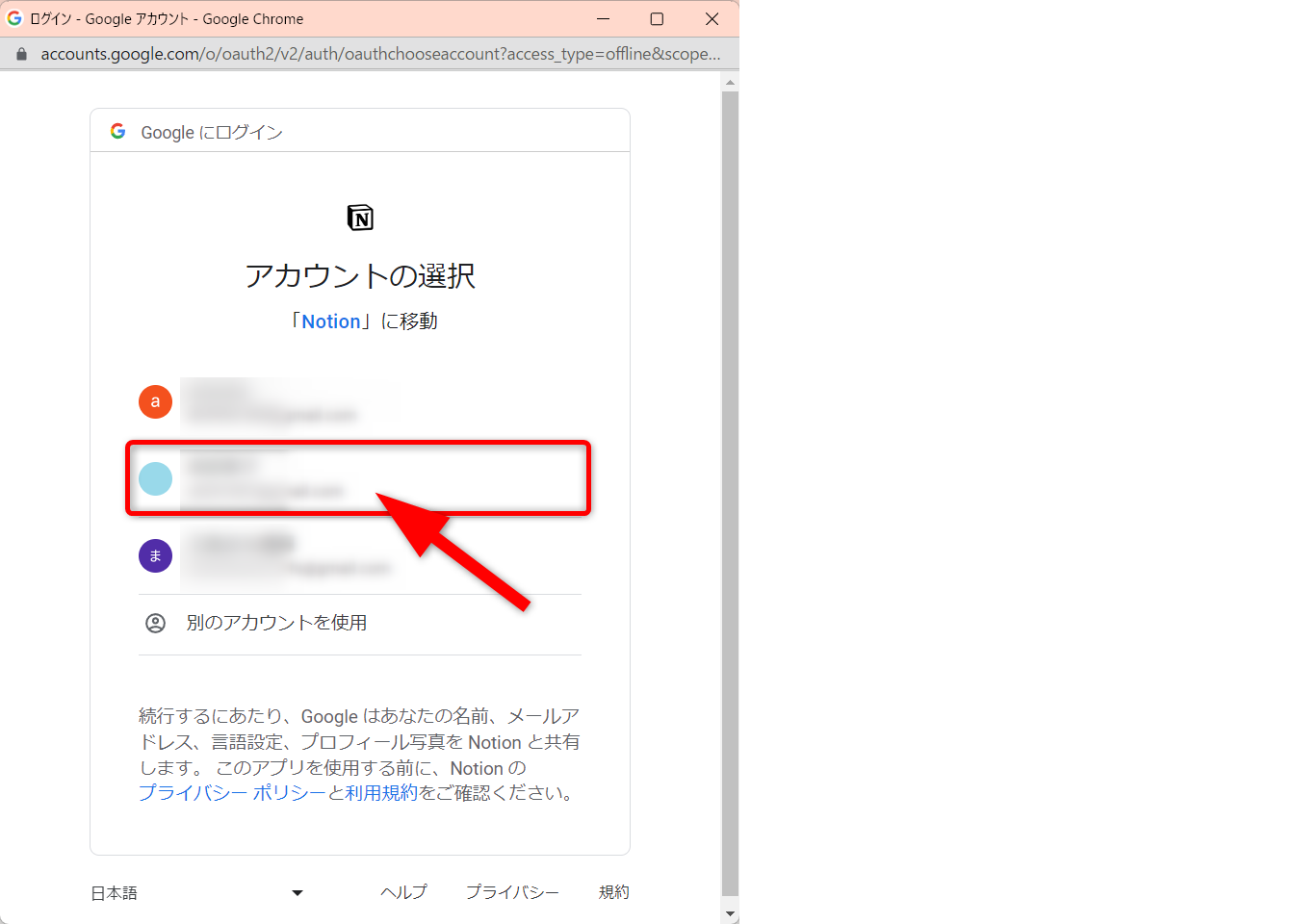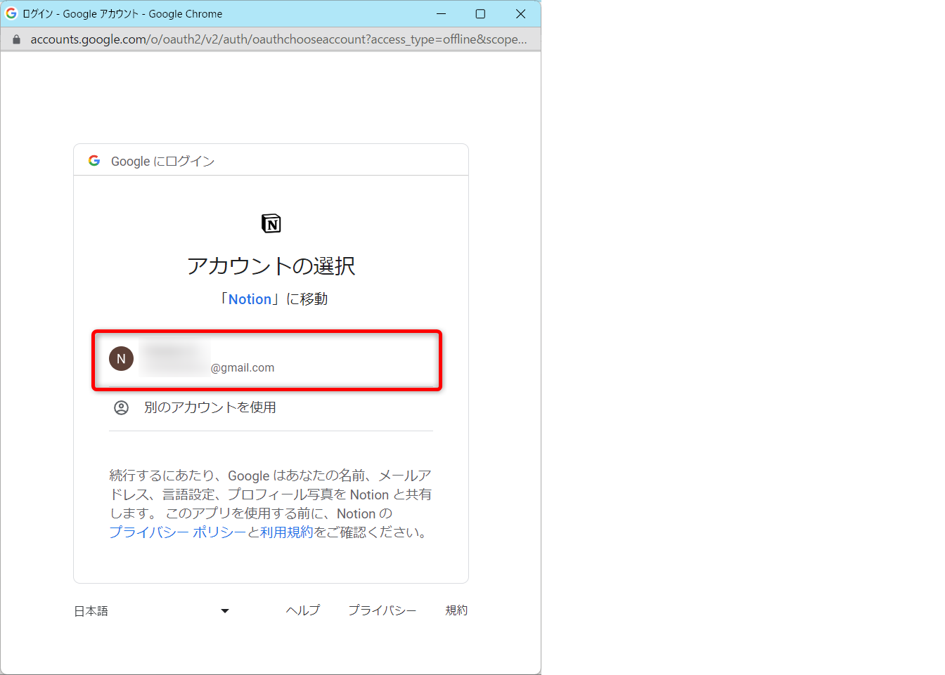 NotionにログインするGoogleアカウントを選択します。