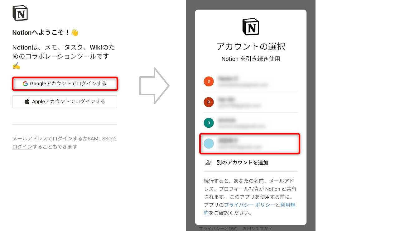 スマホに登録されているGoogleアカウントが表示されますので、Notionにログインするアカウントを選択してください。