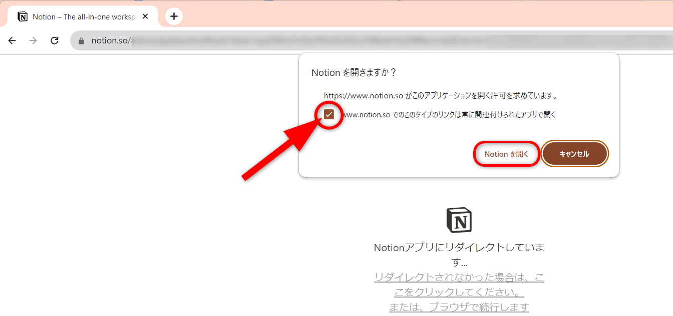 Notionのリンクはブラウザで開きたい場合は、チェックを入れずに[Notionを開く]をクリックしてください。