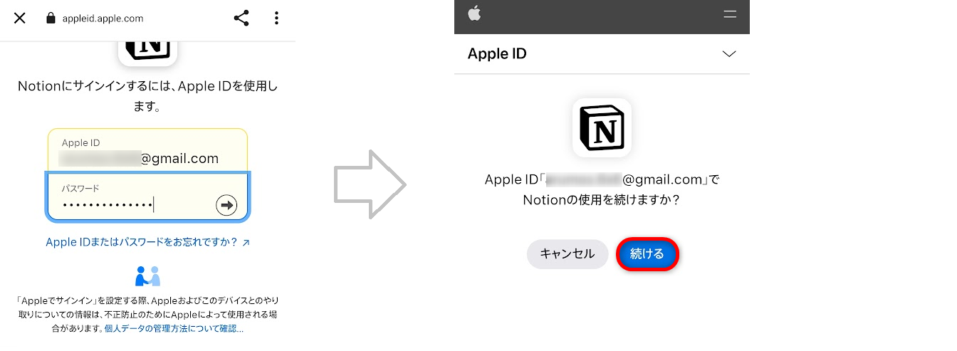 Notionアカウントのパスワードを入力し、[続行]をクリックします。